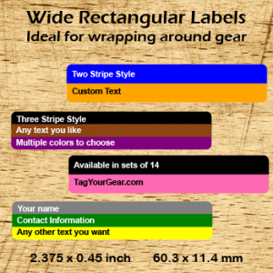 Laminated vinyl labels with 2 or 3 lines of text and color stripes, works well for wrapping cylindrical items.